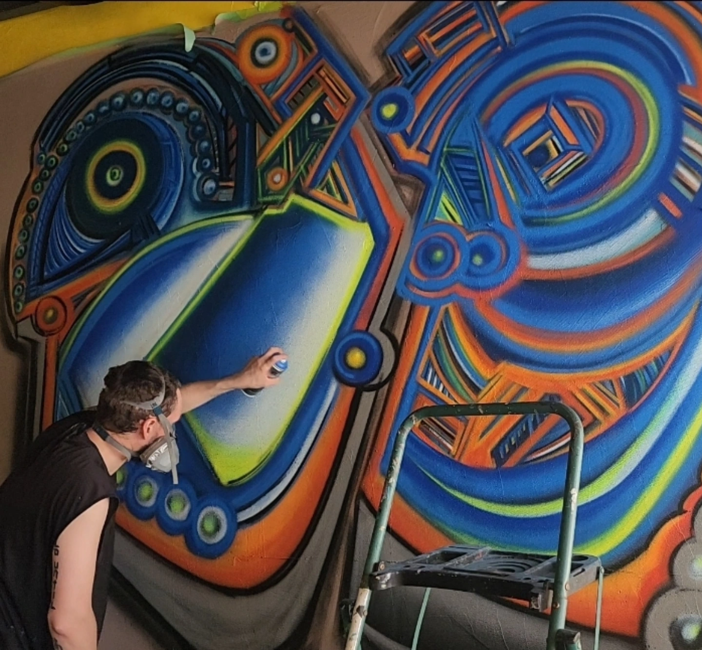 ROAM is a visual artist and muralist whose work explores the intersection of technology, nature, the phenomenon, greed, and the human spirit. Primarily working with aerosol paint, their abstract style blends elements of sci-fi/fantasy art, cyberpunk, cartoons (anime/ manga) and graffiti, resulting in geometric, morphing patterns that depict technological storms, parallel dimensions, and the enduring beauty found in unexpected places.