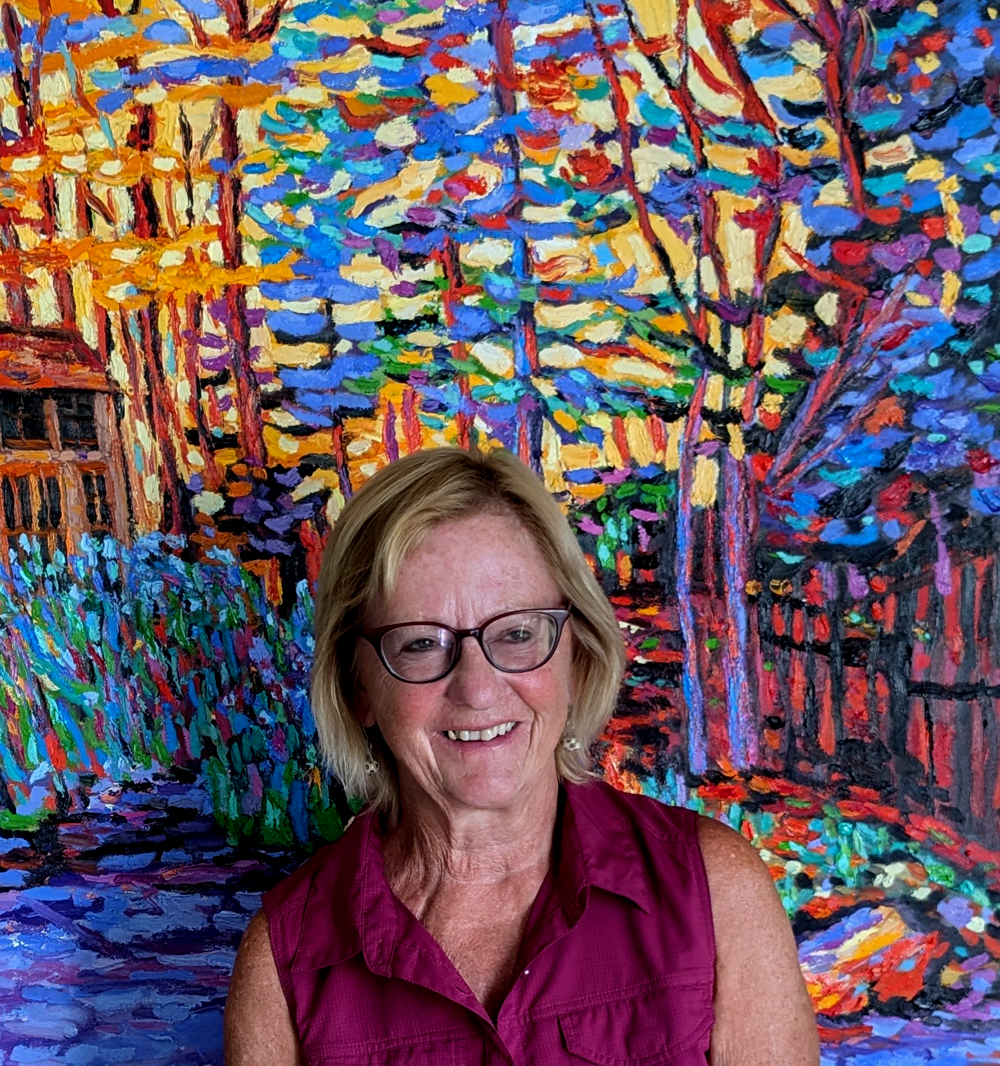 Her work has evolved over the years to her current explorations in colourful impressionistic landscapes.