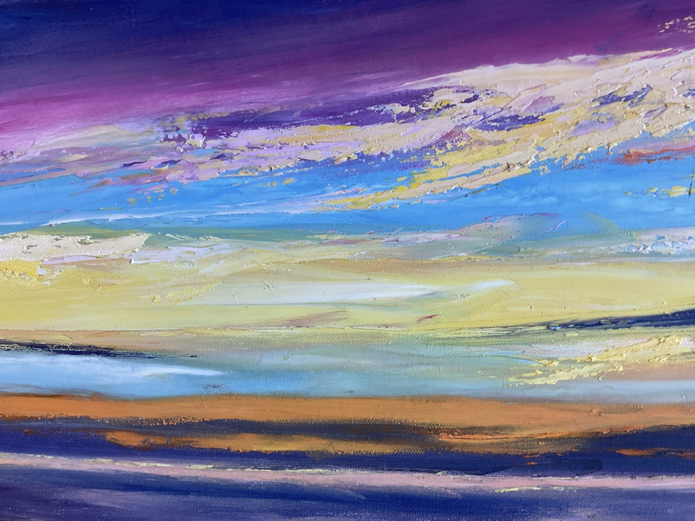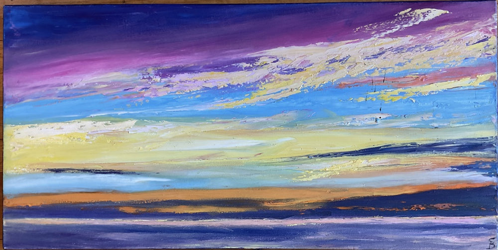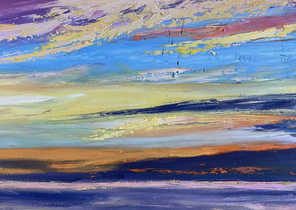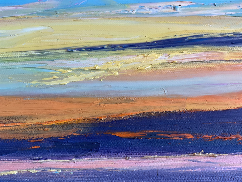 At the end of the day all that remains are the memories. A beautiful serene sunset captured in oil. The unique aspect of this piece is if it is back lit there’s an area by the sun where the light shines through.