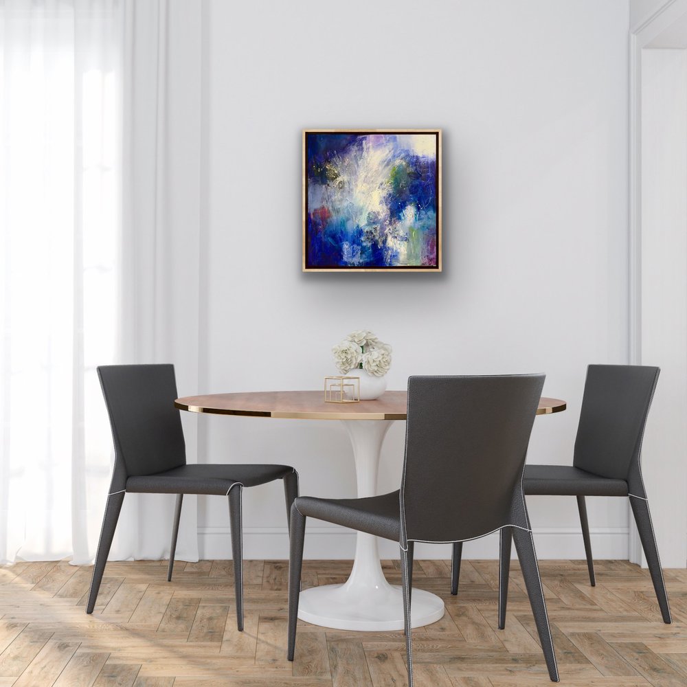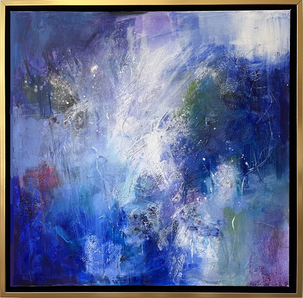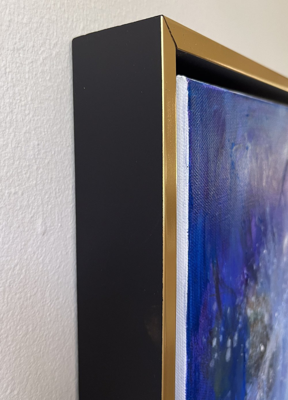 A sizzling piece of energy in deep blues, violet, greens, aqua, and a big splash of white. As a long time Star Trek and Lost in Space lover, this trip around the stars was a joy to paint. I choose to see outer space but someone else may see the spout of a whale in the deep blue ocean. What do you see? Black frame with gold metallic front edges