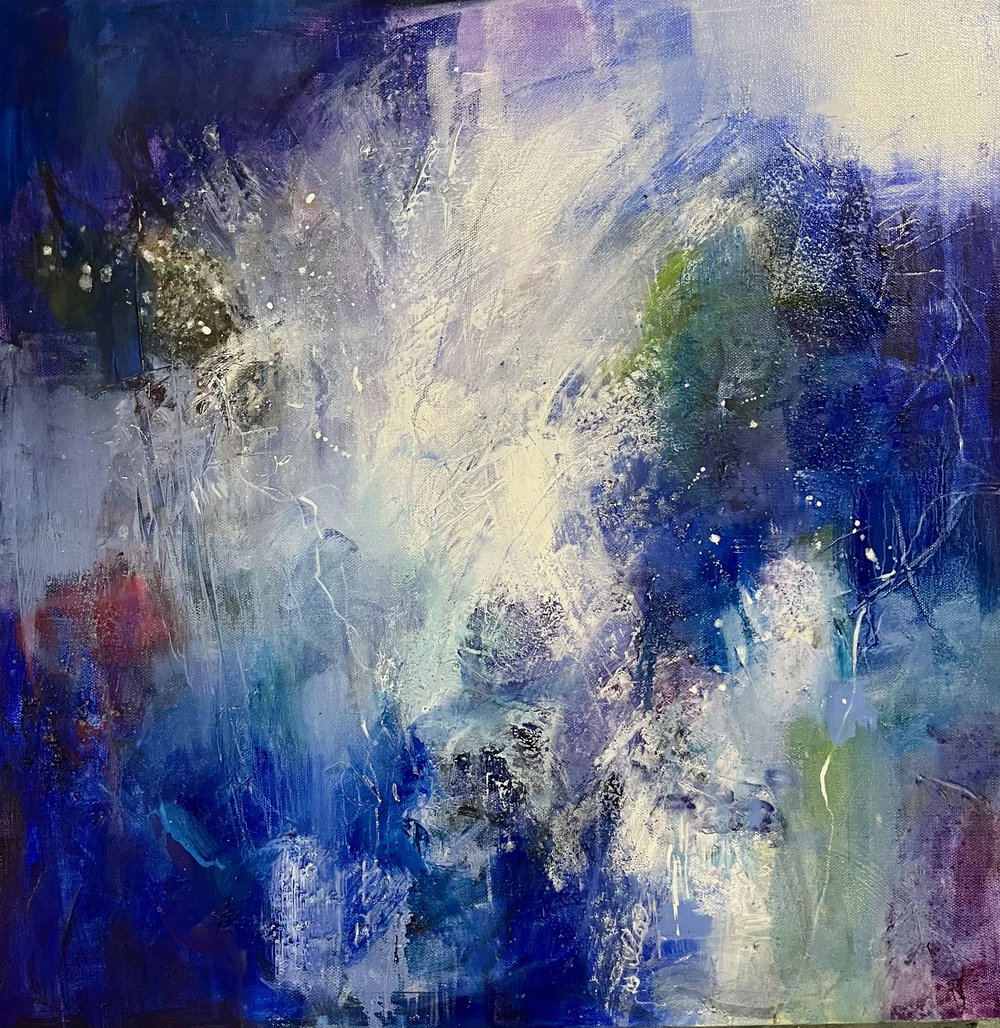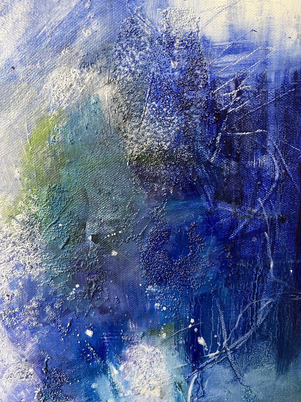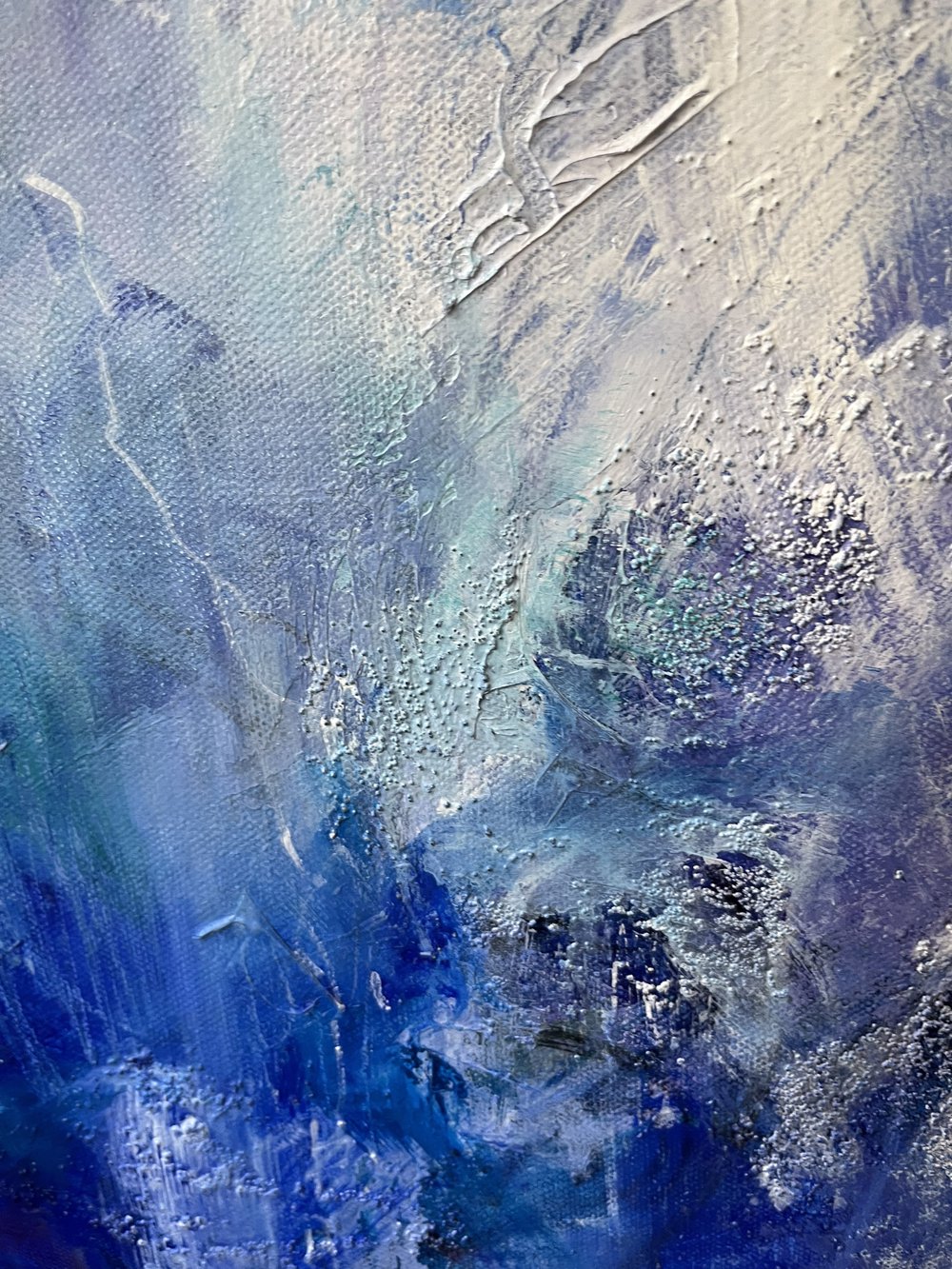 A sizzling piece of energy in deep blues, violet, greens, aqua, and a big splash of white. As a long time Star Trek and Lost in Space lover, this trip around the stars was a joy to paint. I choose to see outer space but someone else may see the spout of a whale in the deep blue ocean. What do you see? Black frame with gold metallic front edges