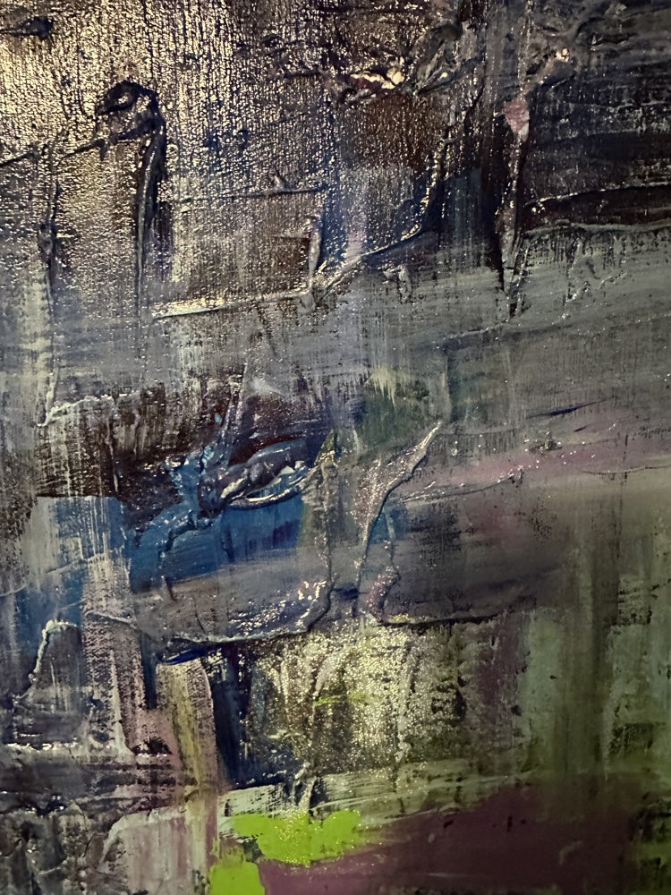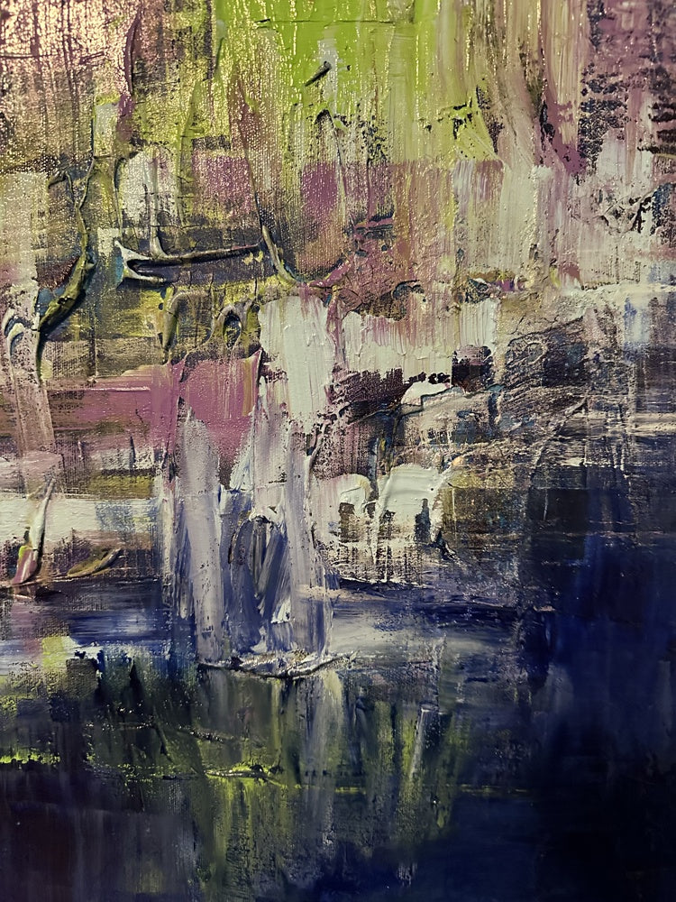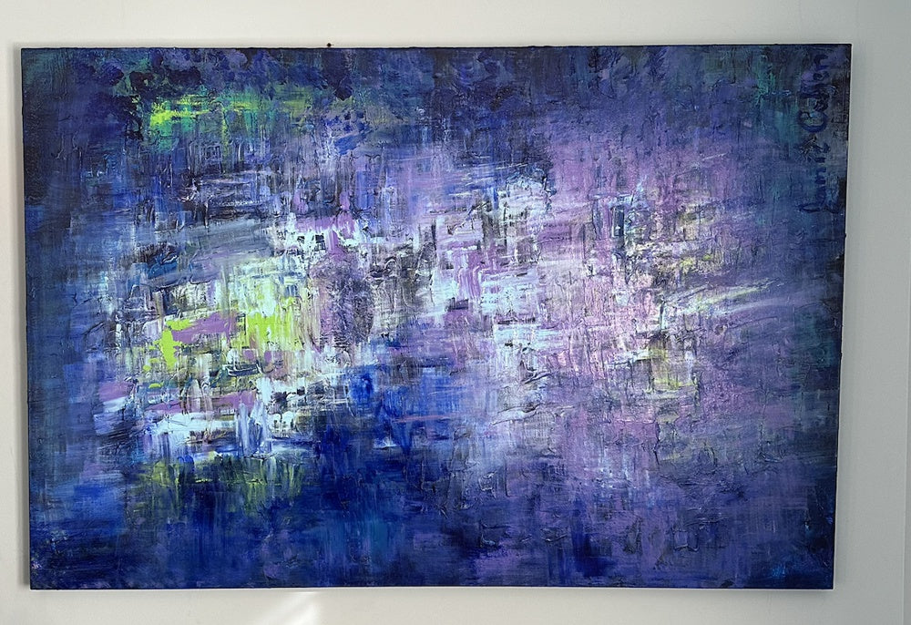 Large-scale Abstract with multiple layers of blue, lilac, white, and yellow.