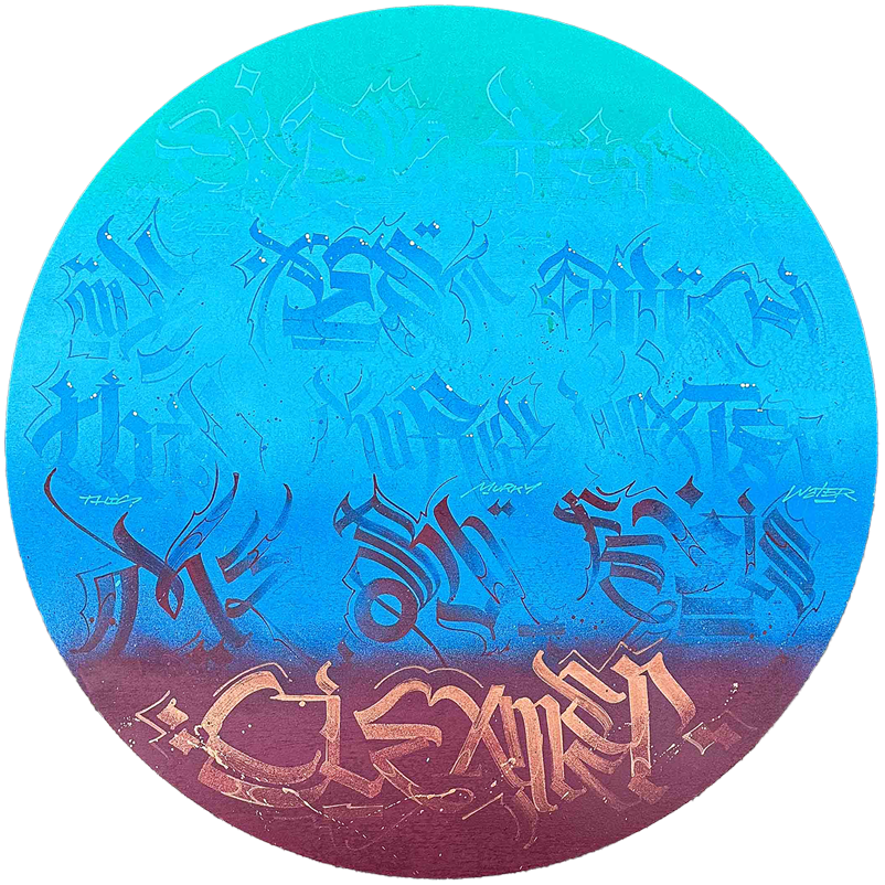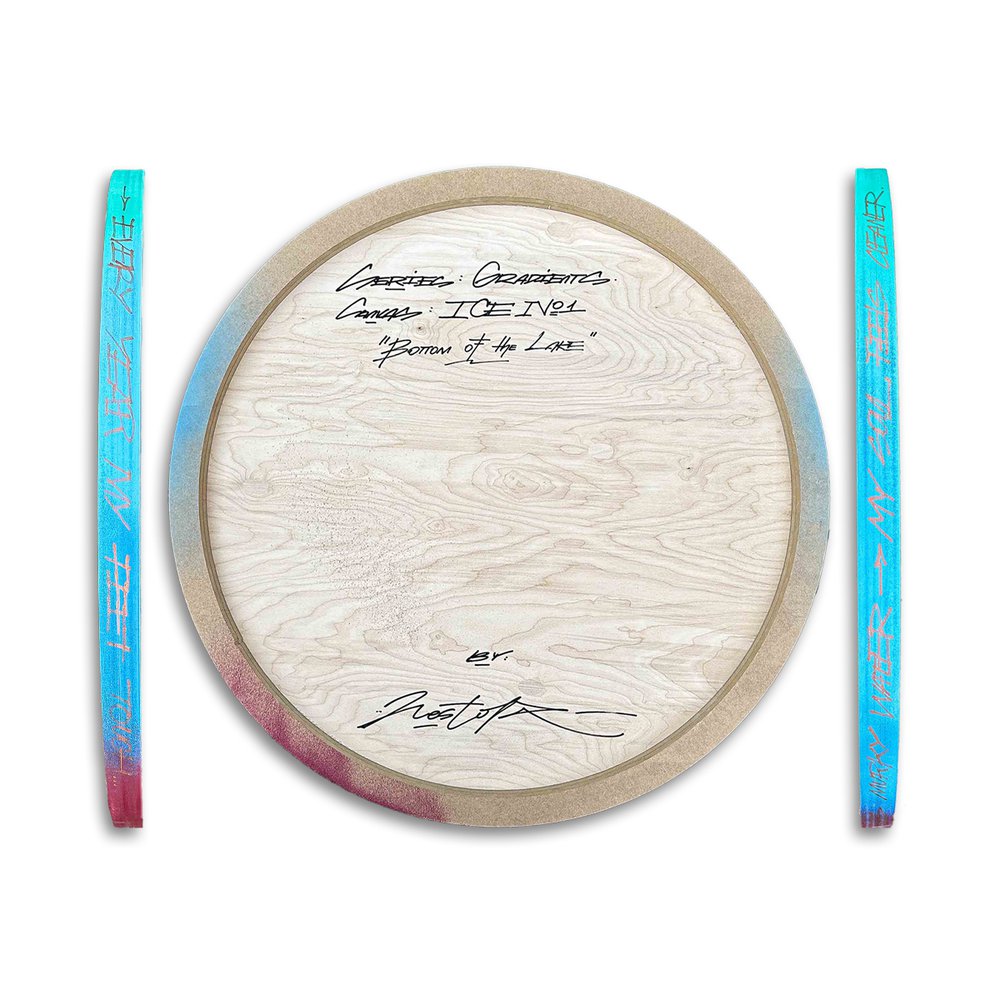 Permanent, acrylic, spray paints on wooden board.