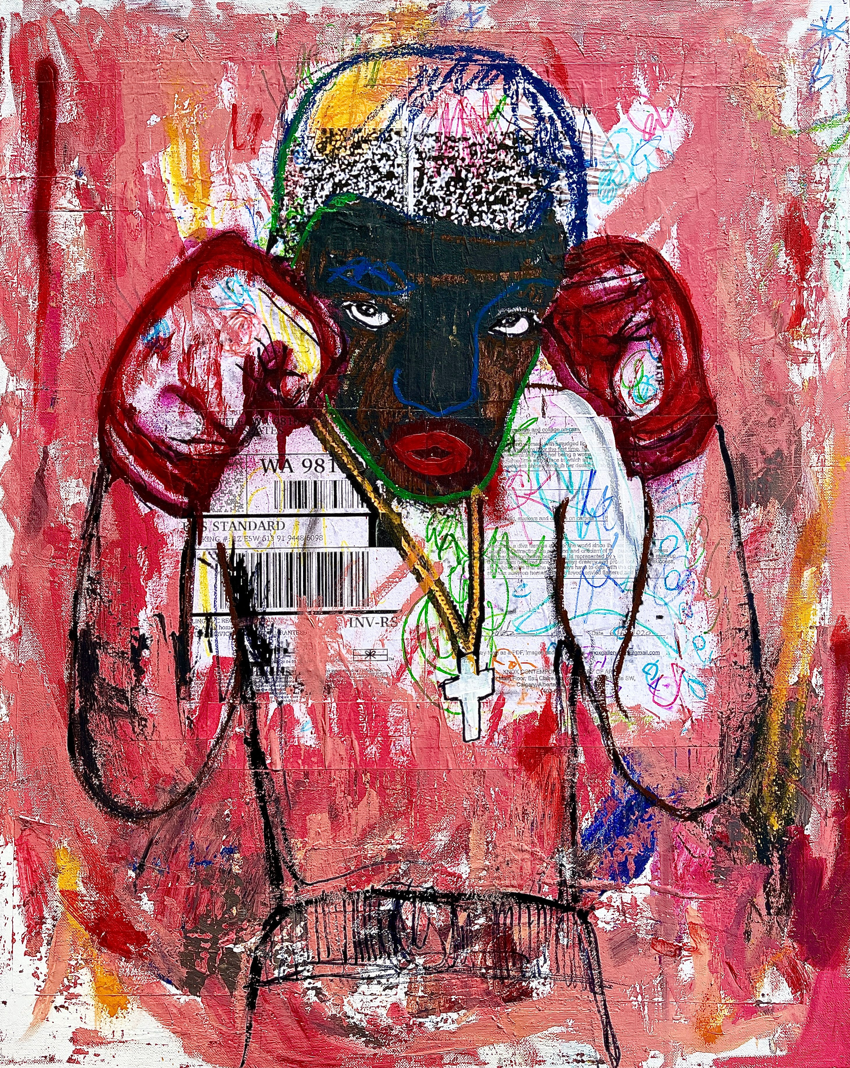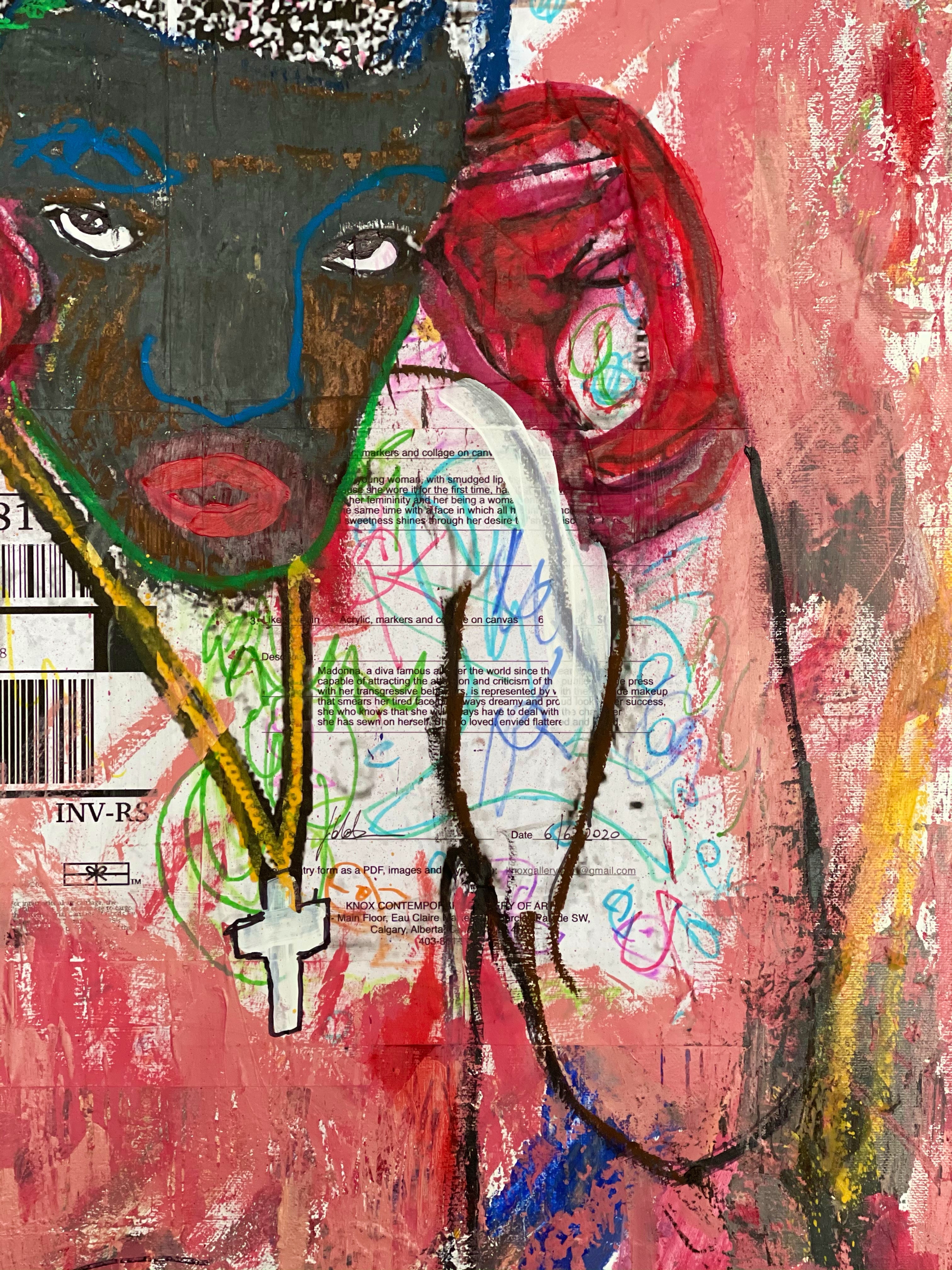 Acrylic, spray, collage, markers and oil pastels on canvas.