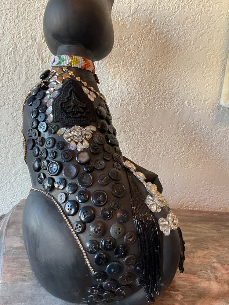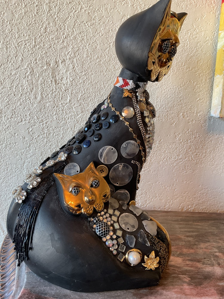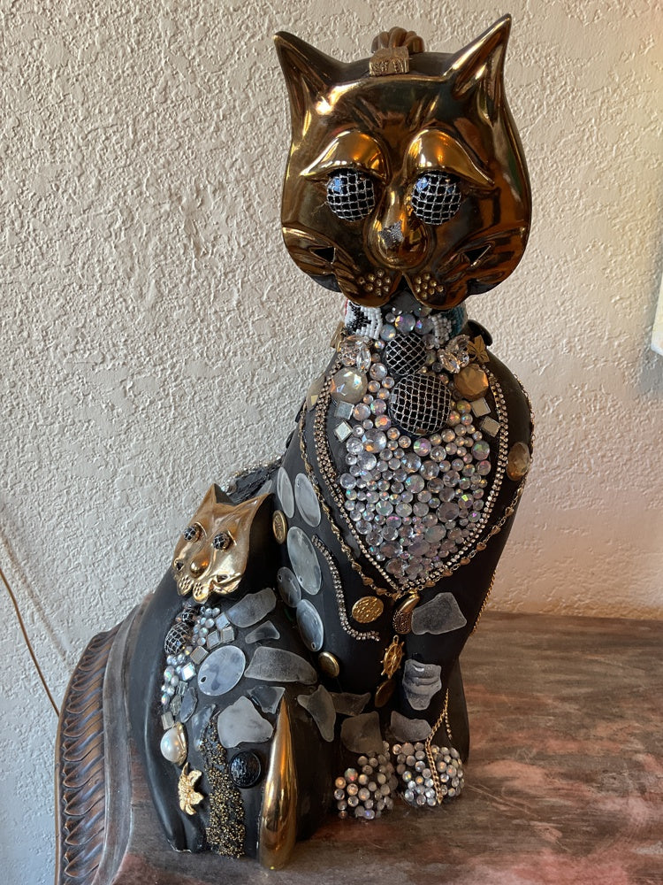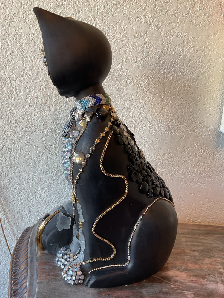 This is an upcycled sculpture. Painted and embellished with sea glass and broken jewellery, buttons and crystals. Perfect to grace any corner