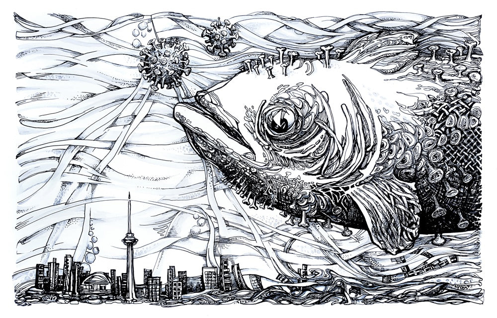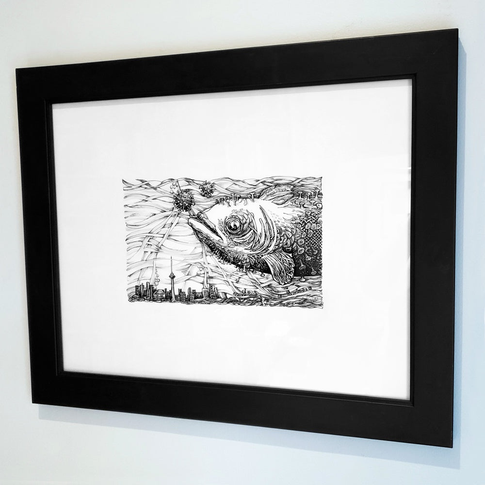 Drawn on a day when it snowed in May of 2021, Coronafish 21 is an allegorical composition reflecting the heaviness and anguish of being in isolation due to Coronavirus. A monstrous fish with the virus spikes (literally) overshadows the Toronto cityscape.