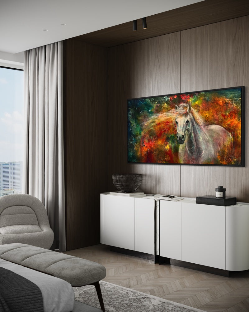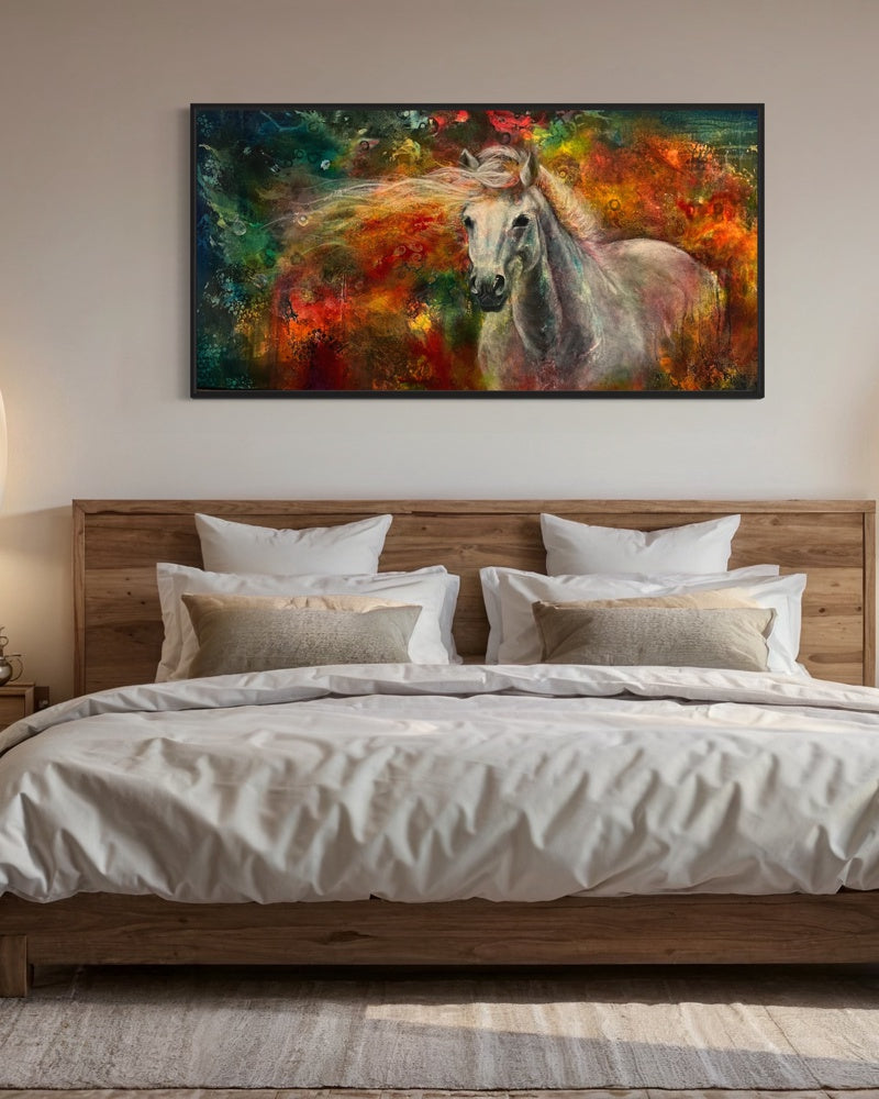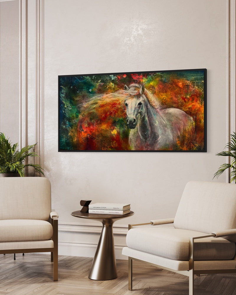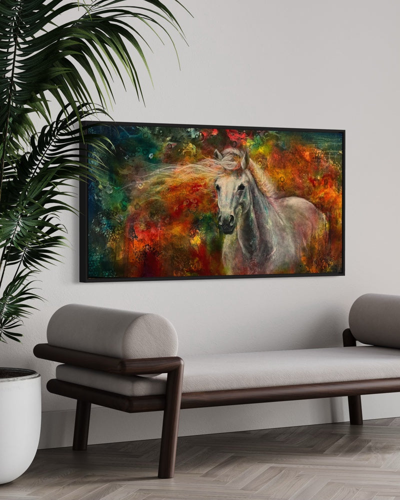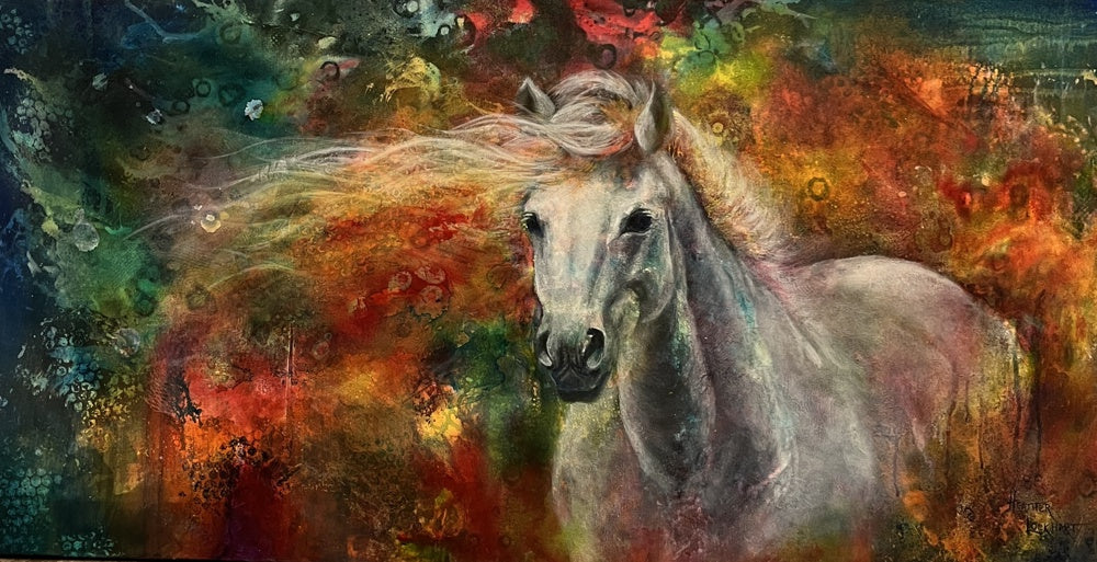 This piece is mounted in a black wood floating frame. This white horse named FREEDOM was inspired by a text in Revelation 19 that talks about a white horse, whose rider was named Faithful and True. I used an abstract painting that I had made, but never thought it was finished. When I thought about "freedom" and her mane blowing in the wind, I felt this abstract background was the perfect background for her. The beauty of all things created continues to cause me to be in awe of the Almighty Creator. Every detail and difference, whether it is any animal, tree, ocean or flower, all created unique and beautiful.