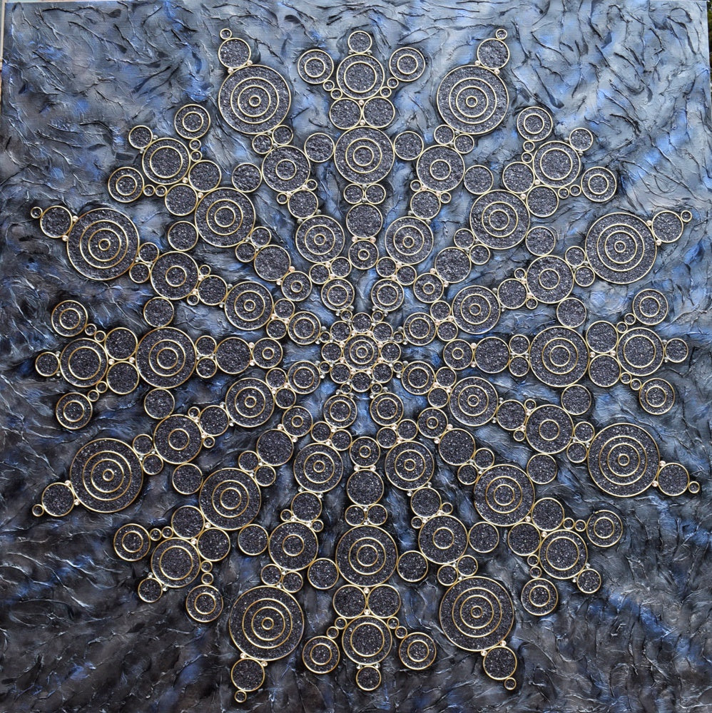 Massive portal featuring over 200 Swarovski crystals, hundreds of gold rings and a wood panel canvas textured in feathers. An incredible piece for large walls!
