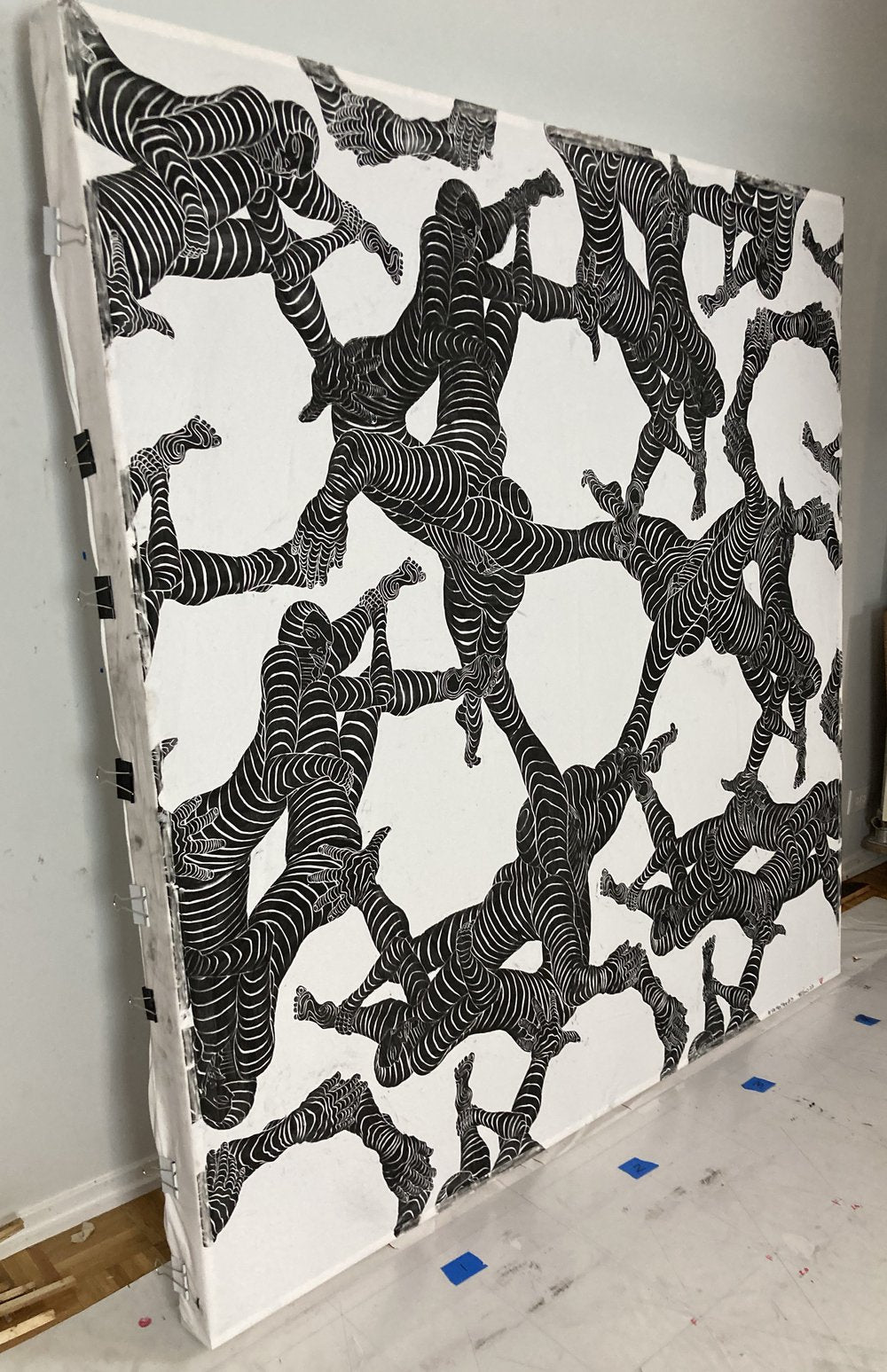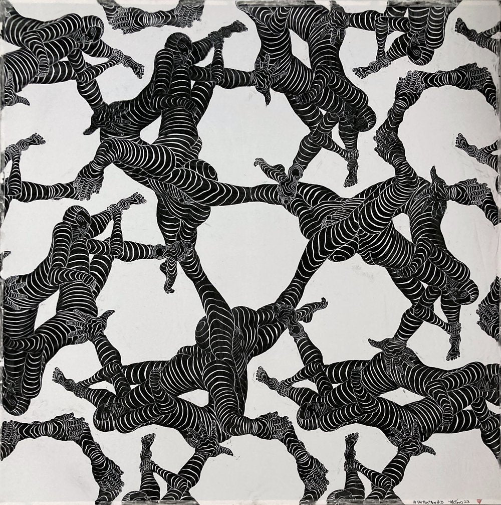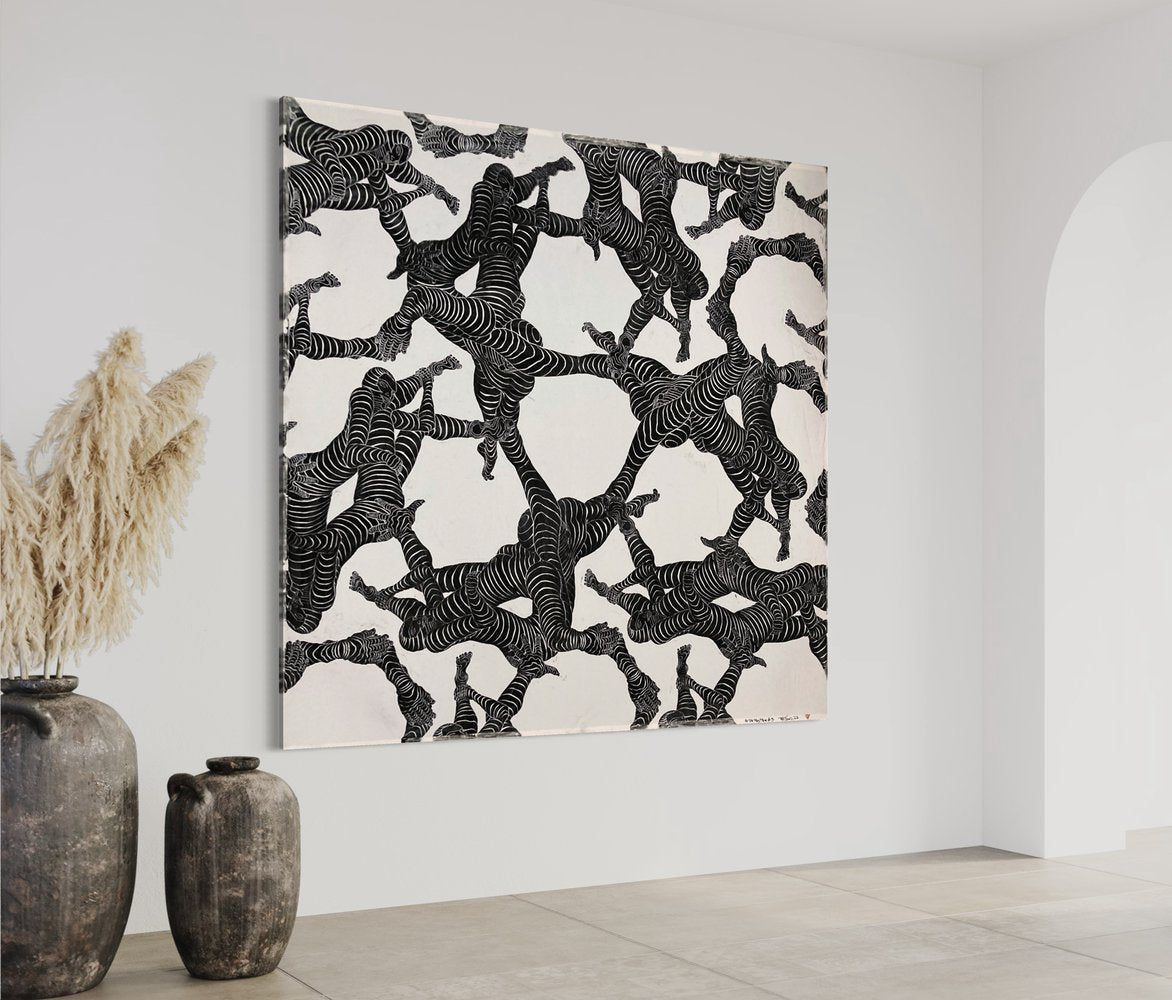 This piece is part of a series that explores the complexity of human identity and the fluidity of gender expression. Through interconnected semi-androgynous human forms, blurring the lines between traditional gender roles, it invites the viewer to question their own assumptions and celebrate the diversity of human experience. It also embraces variety and change in art. Display in any orientation. Unique large-scale multi-impression linocut block print, hand-carved and hand-pressed oil on fabric panel.