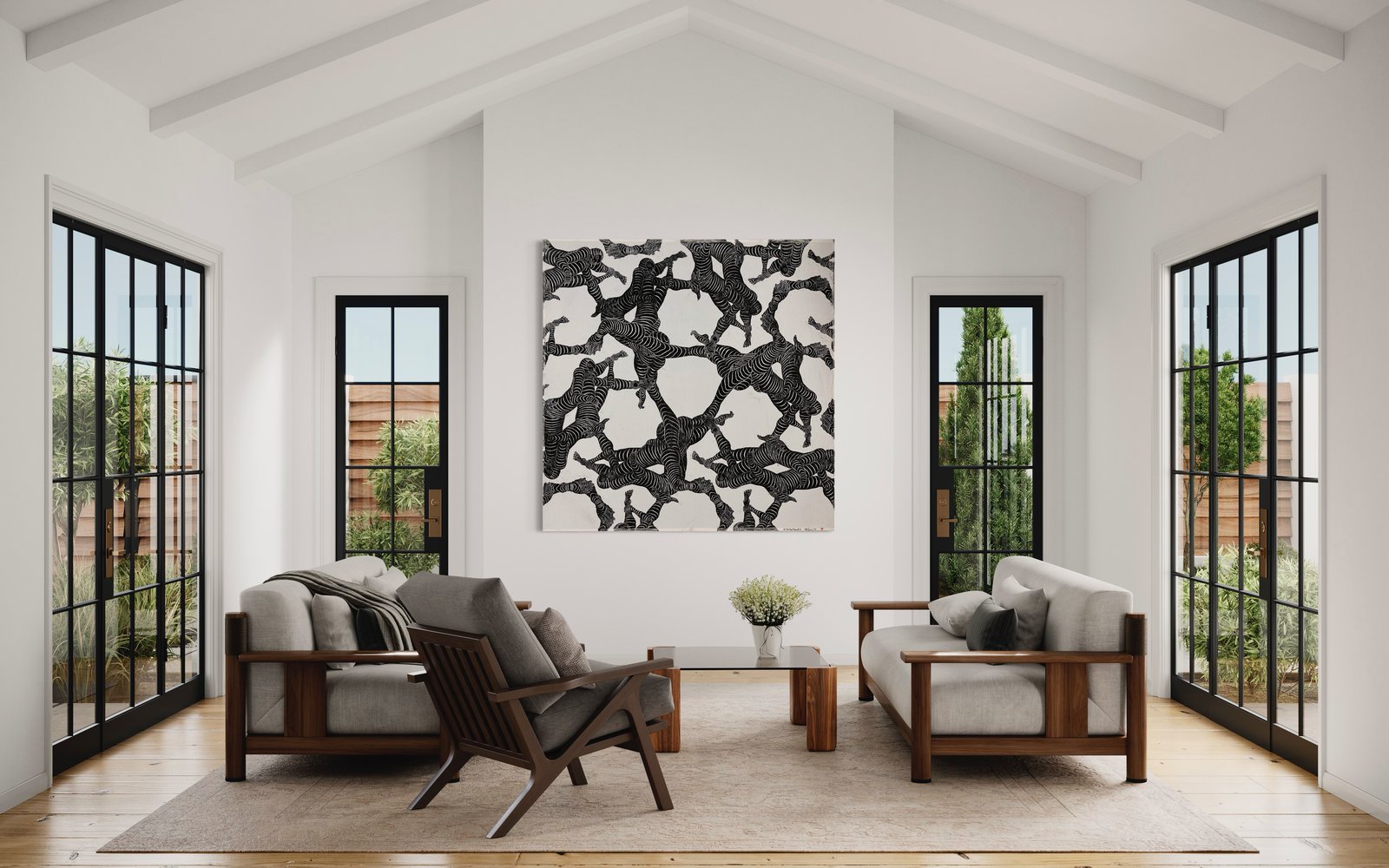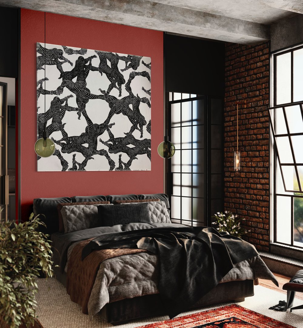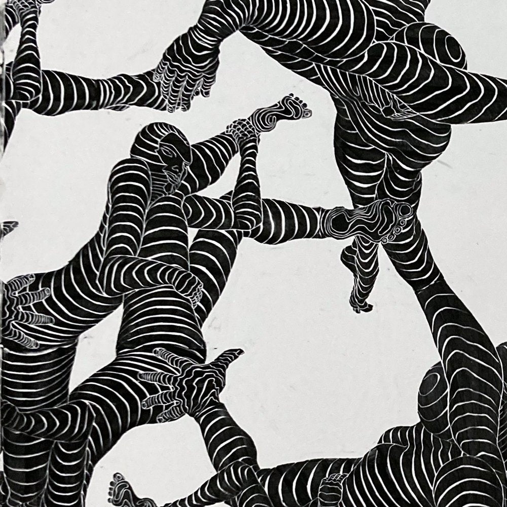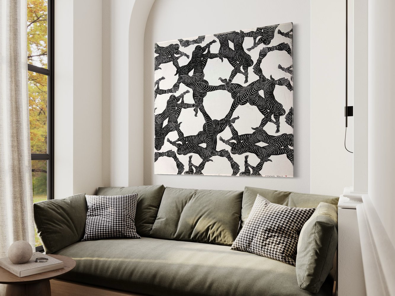 This piece is part of a series that explores the complexity of human identity and the fluidity of gender expression. Through interconnected semi-androgynous human forms, blurring the lines between traditional gender roles, it invites the viewer to question their own assumptions and celebrate the diversity of human experience. It also embraces variety and change in art. Display in any orientation. Unique large-scale multi-impression linocut block print, hand-carved and hand-pressed oil on fabric panel.