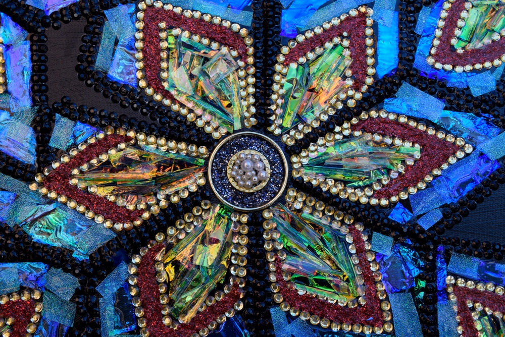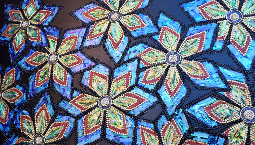 Heaven's Light is electric on this canvas and this piece of art is absolutely otherworldly. Often times when people come back from a near death experience in heaven they say " I saw colours there like I've never seen here..." in this piece we're seeing a tiny glimpse at the vibrancy of those colours. The heavens also guide us to create, in Heavens Light we give thanks for this divine guidance and all of the beautiful and unexpected places it takes us when we follow the light of heaven. Decals, light reflective materials, gold rings and pearls on gallery depth canvas.