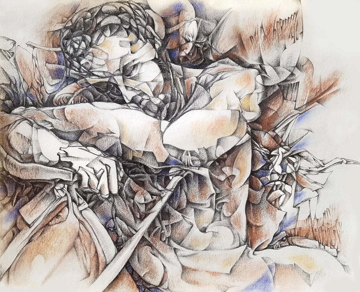 An analytical composition where various elements form a fatigued/sleeping human figure with numerous ominous faces appearing out of its surroundings. It echoes Goya’s famous print “The Sleep of Reason Produces Monsters”, and concentrates on human condition, and inner workings of human mind.