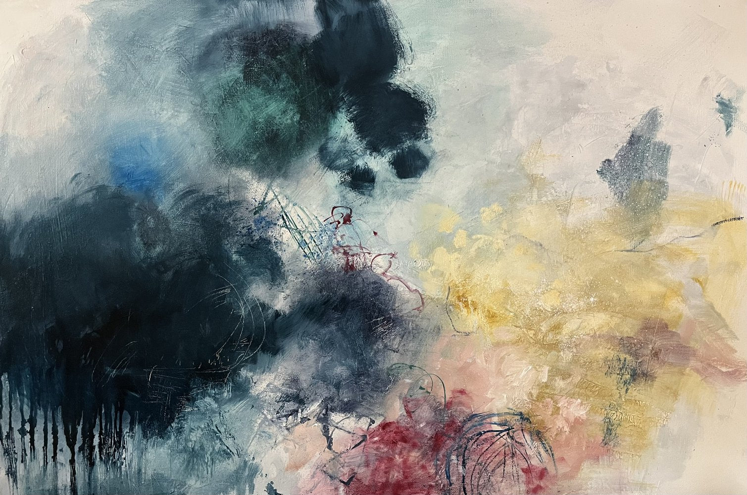A bold sophisticated statement painting with deep teal organic shapes moving and separating across the canvas, giving way to softer colors with marks, splatters, and delicate line work. This piece was inspired by the vastness of the universe and the cosmic auras floating in space.