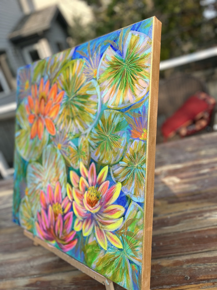 A vibrant mixed media, statement floral, brimming with beautiful blooms. Created layer by layer using many washes of paint to build up the colour story, full of expressive fine line details, patterned elements, in array of hot pinks, soft blush and creams surrounded by vibrant teal. A bright energy filled floral that radiates happy vibes. Original acrylic, pastel and acrylic ink on canvas. Painted using high-quality professional acrylics and varnished for protection. This piece is signed ‘Green’ on the front. Canvas information: this canvas was made with archival-quality natural cotton, and the frame is professionally constructed, with medium-weight cotton duck stretched around 1.5" profile kiln-dried stretcher bars and held in place with a flexible spline. Size: 61cm x 61cm x 1.8 cm ( 24″ x 24″ x 3/4″ ) This piece is UNFRAMED Please Note: Colour varies from screen to screen and devices. Colours are captured as accurately as possible.