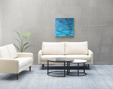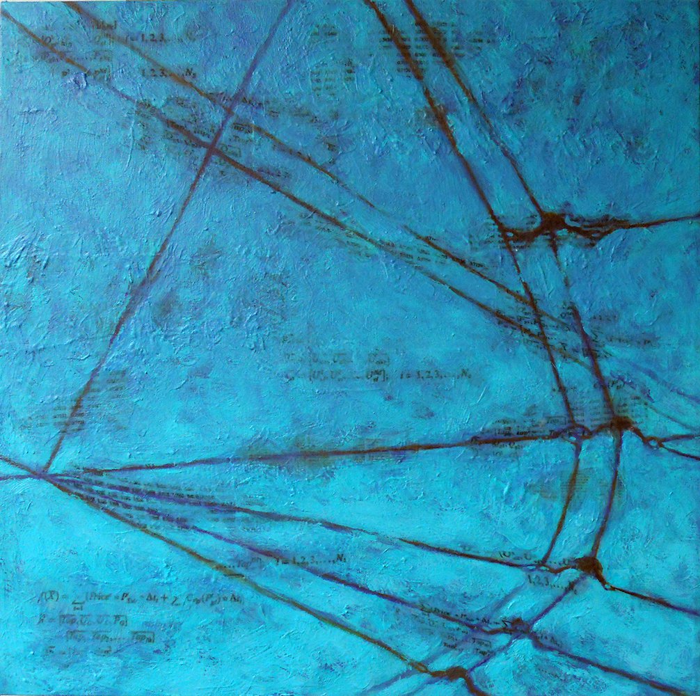 LINESCAPES SERIES: This painting, 'LineScape II, King & Bathurst', represents a chapter in my ‘Totem’ series. With ‘LineScapes’, I look, in closer detail, at the incredible network of wires above us, intersecting the skies over our cities. I focus on the graceful, dynamic patterning they create when captured as a small section of the tangled views overhead. The results are strong, graphic abstract paintings. For each canvas, I choose a lyrical interplaying section of wires to paint. For This one, 'Linescape II', I added a layer of photo transfers of text and numbers that suggest the unheard, unseen communication and energy running through the lines. As I paint over top the photo transfers, I leave areas clear around the linework, creating an aura glowing around the lines representing the power inside.