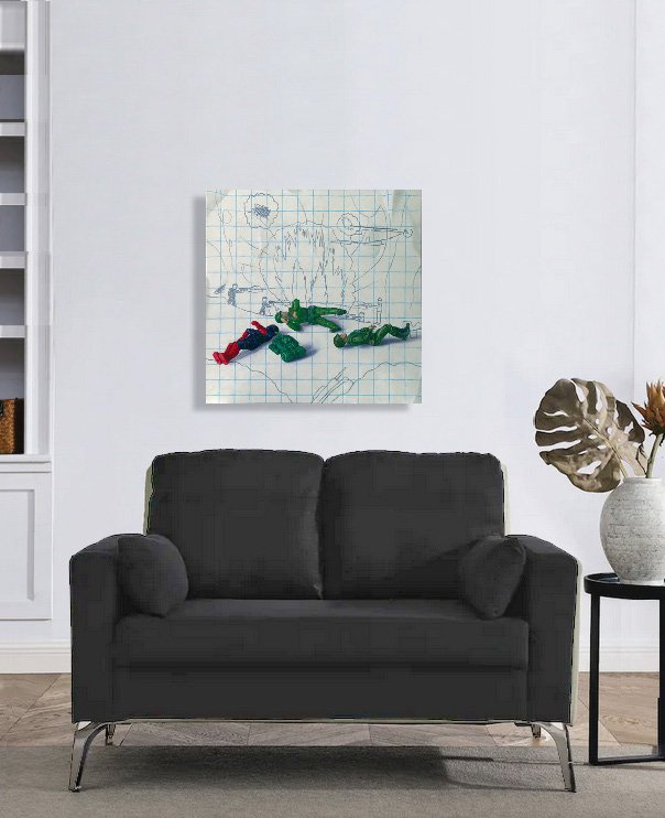 'LOST IN TRANSITION - War Games II' juxtaposes the curious blend of child and adult art in contrast and conflict.