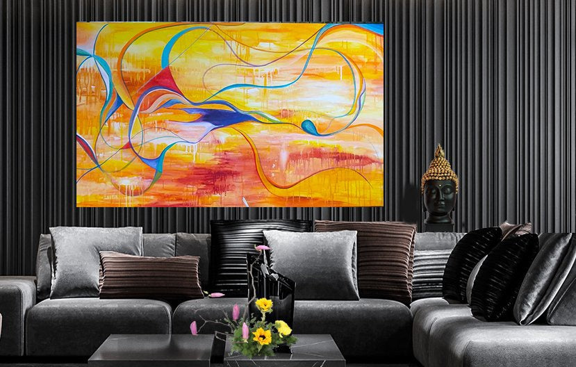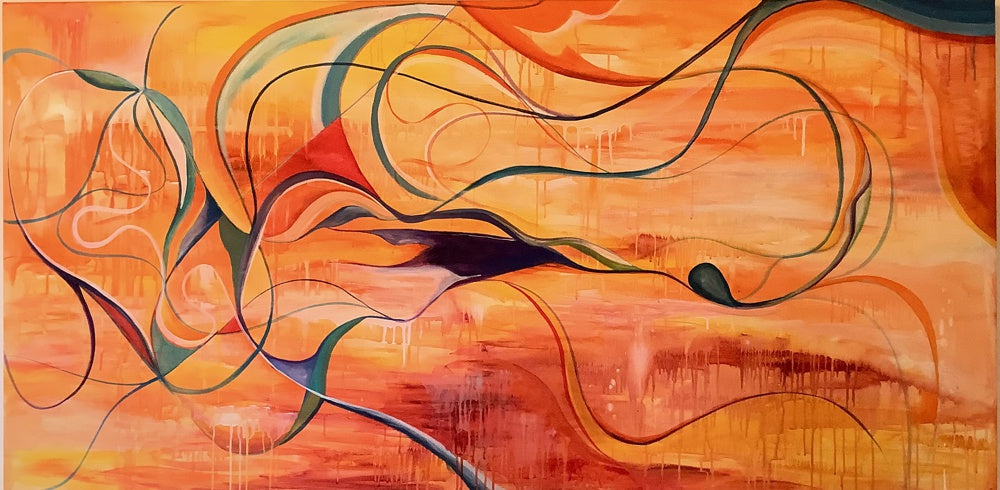 This work is a meditation on movement and internal flow—how energy travels through the body, memory, and space. I approach the canvas with spontaneity, guided by instinct rather than plan. The layered drips suggest impermanence, while the sweeping lines evoke breath, music, or unseen currents. Each curve represents a choice or shift in direction, mirroring the unpredictability of growth and emotion. The start of a new day with its endless possibilities. The warmth of the palette channels both vitality and vulnerability, reminding us that creativity is born in motion and change.