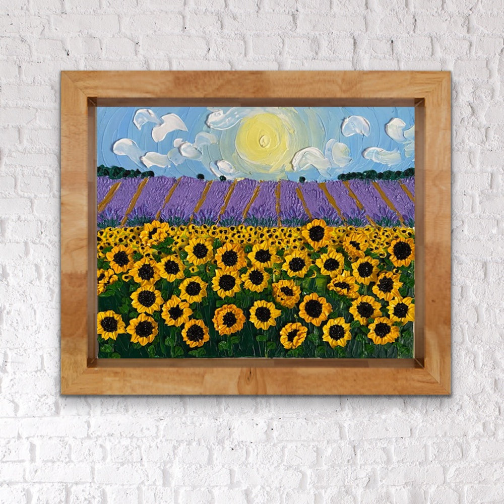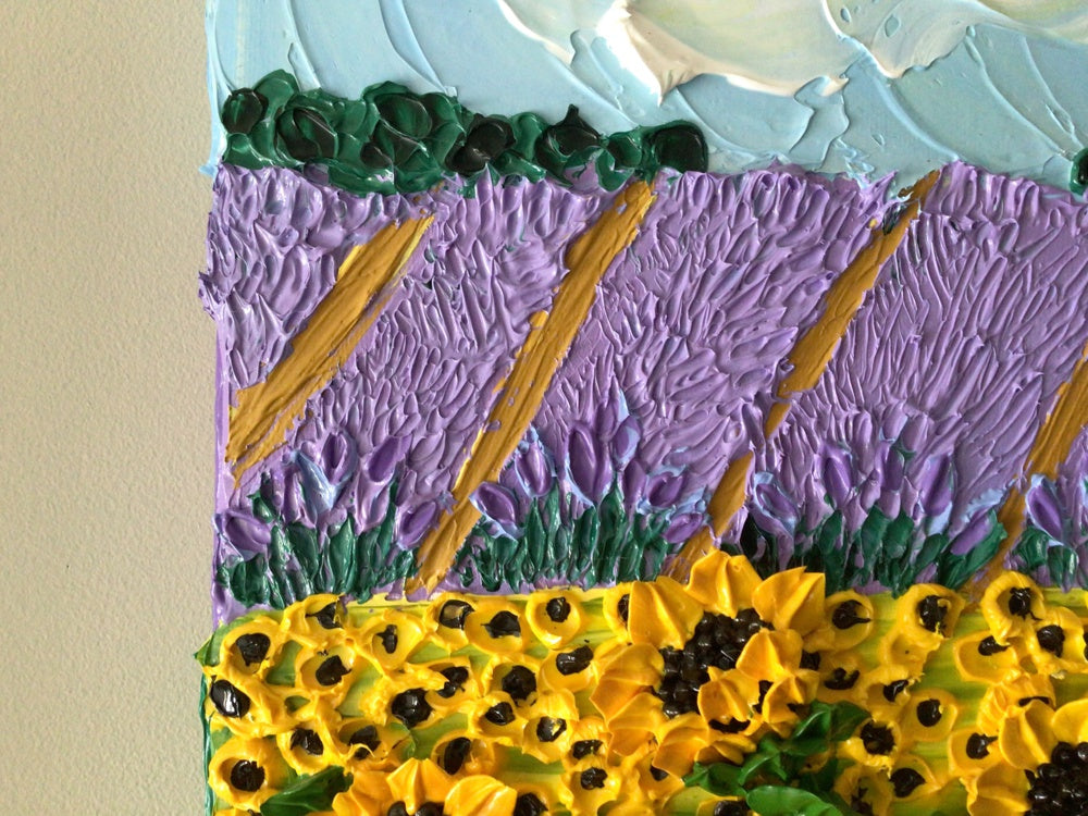 3d sunflowers and lavender field acrylic impasto painting - Hand Painted using cake decorating tips and palette knives - stretched on Canvas using artist quality acrylic paints - Varnished and UV protected • 16x20 inches - Wire hanger attached to back of canvas - Ready to hang Please note, the frame featured around the painting in all of the images is a computer generated image not an actual frame.
