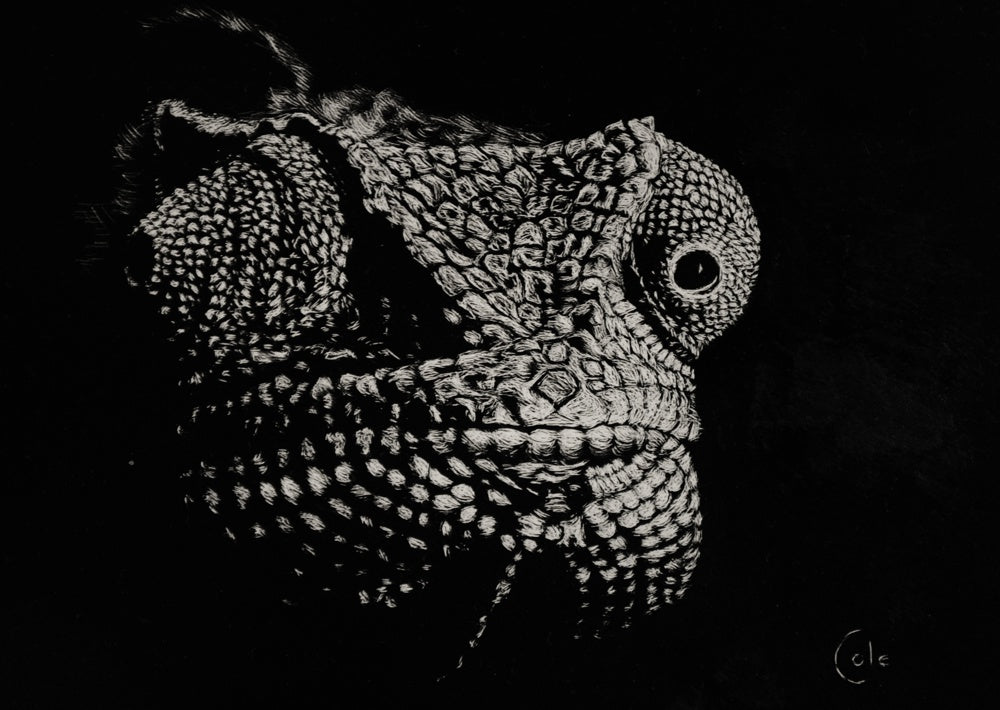 A handmade piece on scratchboard, where a metal quill is used to scrape the black ink surface to reveal the white ceramic layer underneath. Shape, texture, and colour of the animals are all described by the intensity of the scratch with the quill, what direction, and how much I go over the surface.