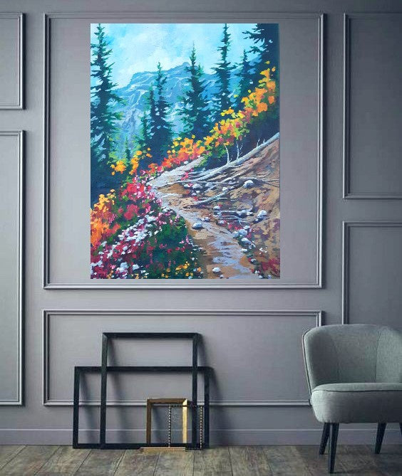 A serpentine trail ascends the mountain, weaving its way through the rugged terrain. Tall evergreen trees flank the path, their towering forms casting dappled shadows on the trail. Alpine flowers bloom along the wayside, adding vibrant splashes of color to the scene. In the background, the mountain stands proudly, its majestic peaks reaching towards the sky. The composition captures the essence of a breathtaking journey, inviting viewers to immerse themselves in the beauty of nature's ascent.